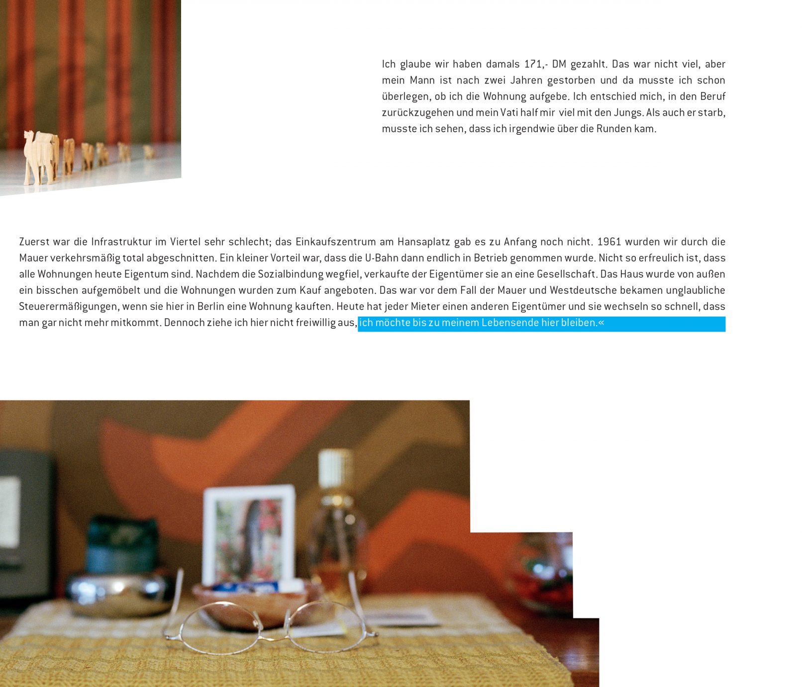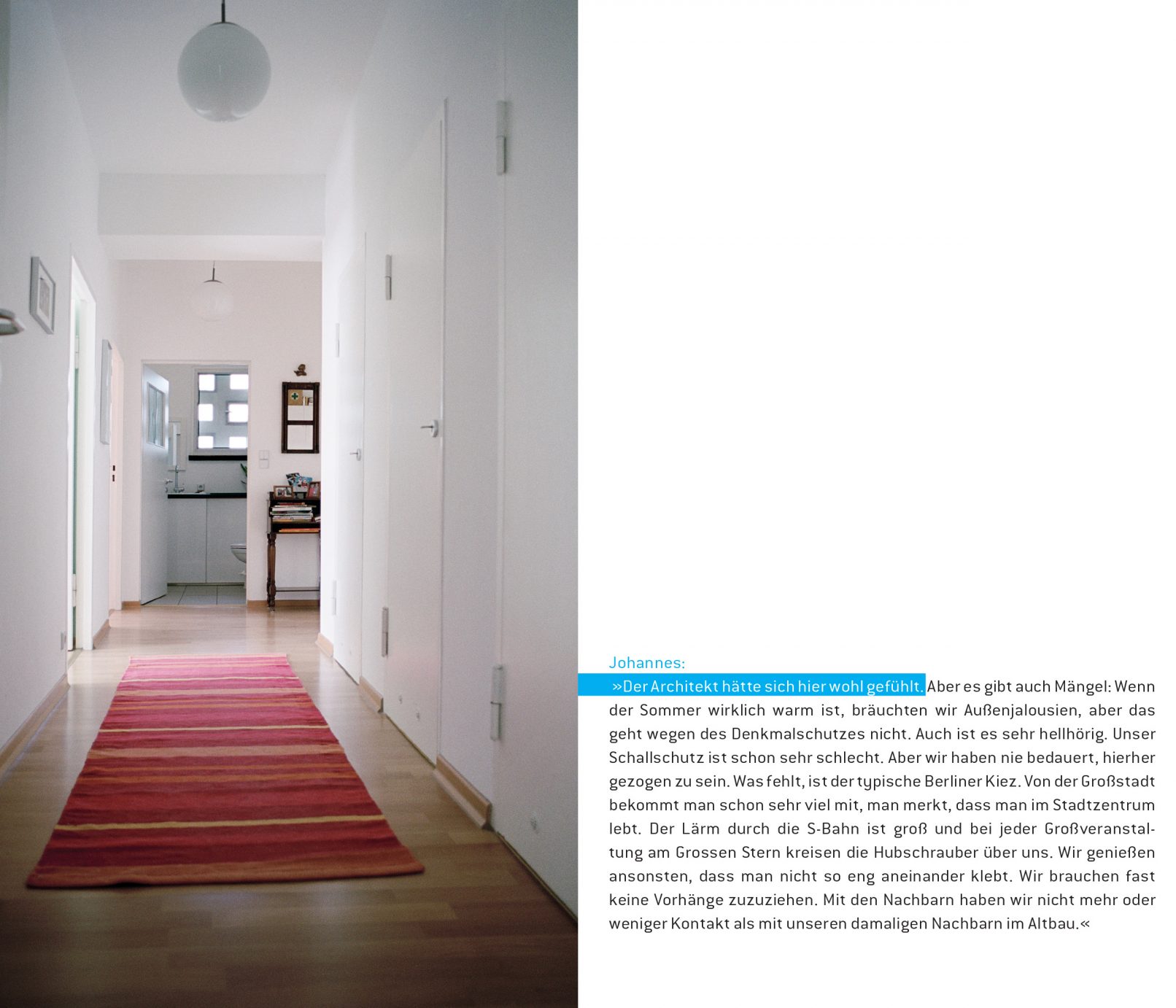 Diesmal waren es nicht nur die Erstbewohner, die ich treffen wollte, sondern auch junge Bewohner, die sich bewusst für dass Viertel entschieden haben. Diese Zusammenstellung war das besondere an diesem Projekt. Aus neun Gebäuden würden je zwei Bewohner im Wort und Bild portraitiert. Die Journalisten habe ich aus verschiedene Länder zum Mitwirkung organisiert. Die Wohnungen in den verschiedenen Häusern sind wirklich interessant geschnitten. Sogar die kleinste Wohnung ist dort besonders, was man von aussen nicht immer vermuten würde.
